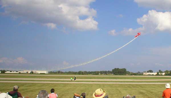 August 02, 2003Sean TuckerHere're a couple of shots of Sean Tucker, one of the most popular airshow pilots in the world. He's from Salinas, California which is near where I lived in California. For years before Sean "graduated" to Oshkosh I saw him at local and regional airshows. When he first appeared at Oshkosh, and made a huge, good, first impression, I was able to say to everyone, "Oh that's just Sean, yeah, he's pretty good." Comments