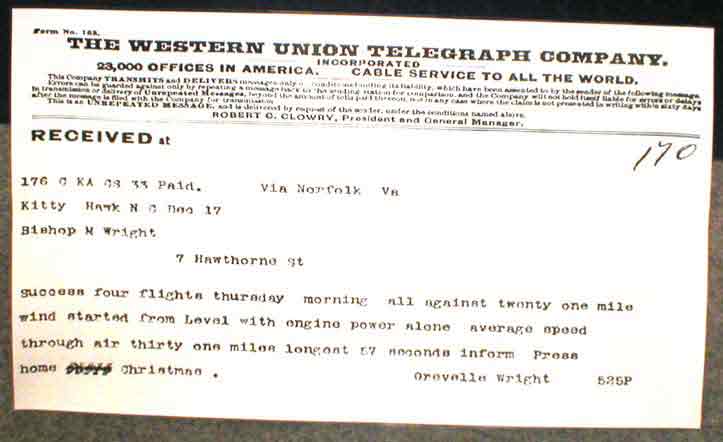 August 03, 2003Inform the MediaHere's a copy of the telegram that the Wright Brothers sent home after their successful flight. My favorite part of this is that they tell home to "inform Press". They weren't just a couple of homey-folksy tinkerers. They knew that what they were doing had historic significance. Comments