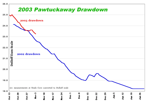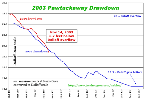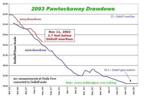 I won't clutter up the place with another copy of the monday chart, but the lake level here at Pawtuckaway dropped 4.3 inches in the past 24 hrs. The biggest one-day drop all last fall was 2.5 inches.